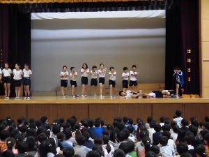 体育委員は、水泳のきまりを楽しくわかりやすい劇にして発表しました。