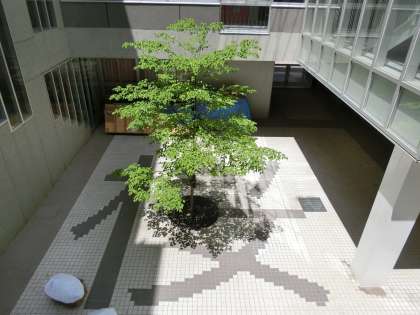 ヤマボウシは、ボップや桜ホールのある1階より下の桜フロアにあるまわりを校舎に囲まれたところに生えています。桜ホールに降りる階段の横からよく見えます。