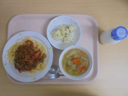☆6月18日(月)の給食の写真です。(スパゲッティピザソース 牛乳 コンソメスープ ジャーマンポテト)