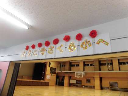 三年生は、体育館の入り口に「ようこそさくら小へ」の文字を折り紙などをちぎって張りつけて、歡迎のムードをつくりました。