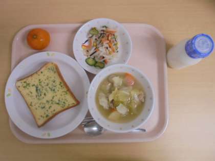 ☆6月26日(火)の給食の写真です。(ガーリックトースト 牛乳 ポトフ 大根とツナのサラダ 冷凍みかん)