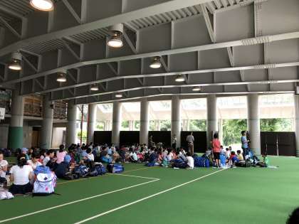 午後12時05分昼食を終えました。ご家庭で作ってもらったお弁当をおいしく食べていました。これから記念撮影のあと宿舎に入ります。少し雨が降ってきたので、屋根のある広場で昼食だったのですが、もう晴れてきました。全員元気です。