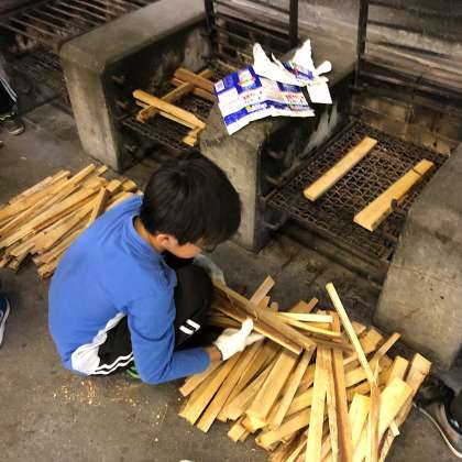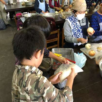 午後2時45分飯盒炊さんが始まりました。さぁ失敗せずにカレーが出来上がるでしょうか?かまど係、カレー係、お米係の分業制です。作業のはじめの部分をお届けします。そして、お米係とかまど係の様子です。