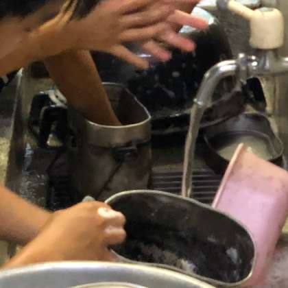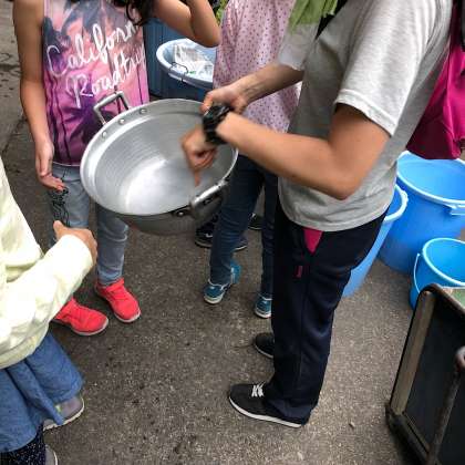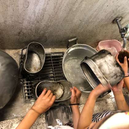 片付けでは、なかなかこびりついてとれない汚れを何度も何度もゴシゴシ磨きます。点検の先生のところ持っていきますが、なかなか合格がもらえません。良い経験です。