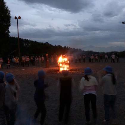 キャンプファイヤーは、大盛り上がりでした。歌からはじめ、火の神の登場。勇気、友情、絆の炎を点火しました。