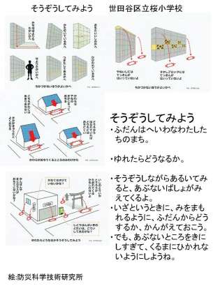 地震で揺れたときに、ブロックの壁は倒れてくると思ってください。また、屋根のかわらも屋根の坂に沿って落ちてきます。屋根の坂が急な家の瓦は特に注意が必要です。看板や神社の鳥居なども注意が必要です。日ごろから危険な場所をよく見ておいてください。