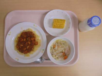☆7月12日(木)の給食の写真です。(チリビーンズライス 牛乳 ABCスープ 蒸しとうもろこし)