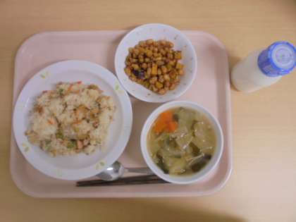 ☆7月17日(火)の給食の写真です。(子ぎつねごはん 牛乳 野菜のみそ汁 大豆とさつまいもの甘辛揚げ)