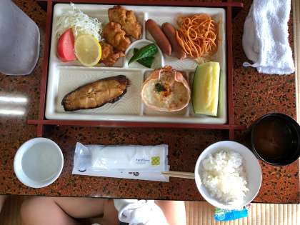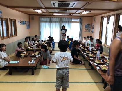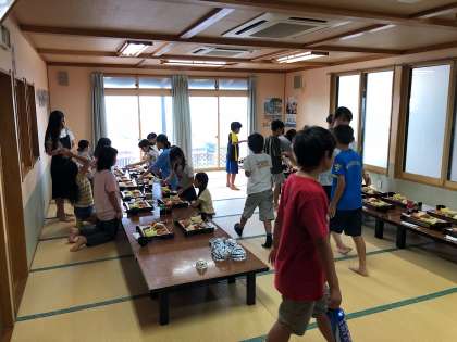 17時30分から夕食です。コシヒカリ100パーセントのおいしいご飯やメロンなどみんな腹ペコだったのであっという間に完食しました。この後は、津波を想定した避難訓練と散策です。