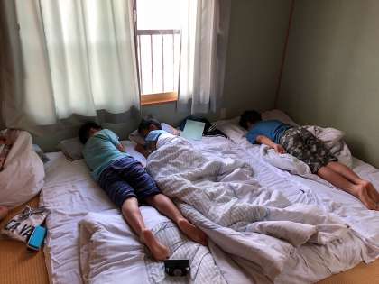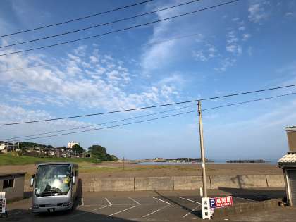 サマースクール2日目の朝です。天候は晴れです。予報では気温33度くらいまで上がるそうです。気温は高いですが、海風が気持ちよく、今日のコンディションも良さそうです。これから朝の班長会議が始まるところです。写真は、起床時の様子です。小竹屋さんの前には海の家が並んでいて朝から駐車場の呼び込みが盛んです。これから朝食です。