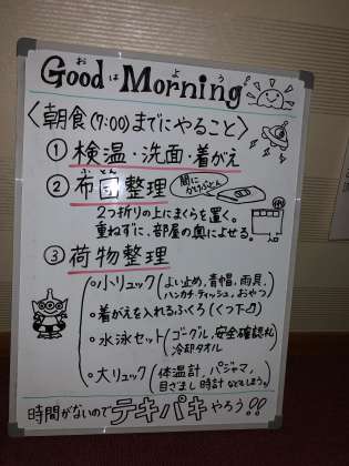 3日目の朝です。朝晩は涼しく過ごしやすい鯨波です。最終日なので荷物整理をしつつ海泳ぎの準備をします。天候は良好。発熱者は37.0度が一人。これからの朝食の様子を見て全員で海泳ぎに行く予定です。