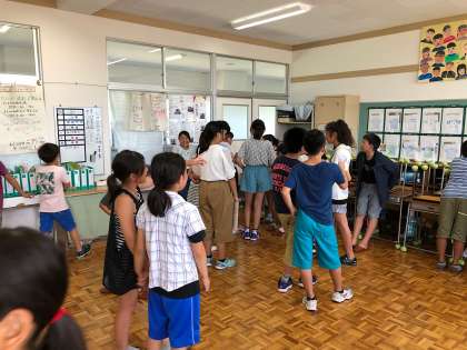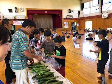 桜小学校の児童たちは野菜と網代焼きをお土産にいただき、簡単な自己紹介をする交流をしました。