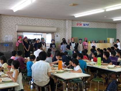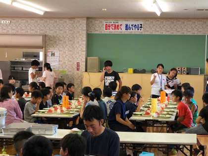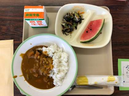 日吉小学校にて給食をいただきました。メニューはカレーライスとひじき、スイカでした。夏野菜は柏崎で採れた野菜です。桜小学校の給食もおいしいですが、日吉小学校の給食も美味しかったです。