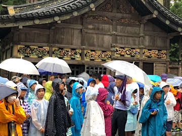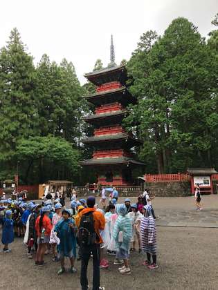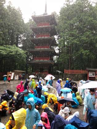 カッパを着て東照宮に歩いて向かいました。宿から東照宮はすぐです。日光東照宮の五重の塔の前でガイドさんを待っていたときです。やはりきました大雨です。しばらく強い雨が降り続きました。階段を上がり見猿、言わ猿、聞か猿の説明を聞きました。