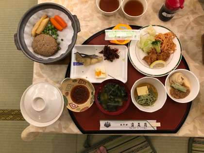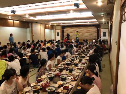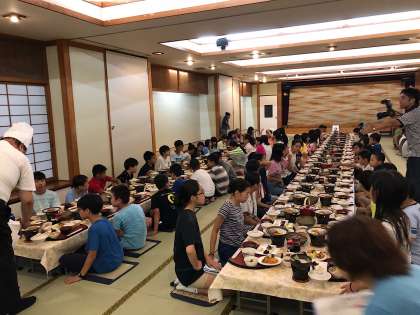 午後6時00分予定を変更して、入浴後の夕食となりました。今日一日の行程が盛りだくさんだったので、疲れた児童が多かったと思います。おかげでお腹ペコペコになりました。美味しく豪華な食事をいただきました。