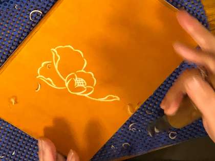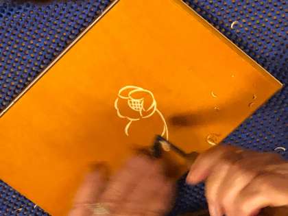 午後7時30分から日光彫り体験をしました。それぞれ何を彫るか、あらかじめ下書きがあります。まずプロの方にお手本を見せていただきました。さすがプロ!皆、大きな拍手を送っていました。