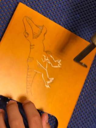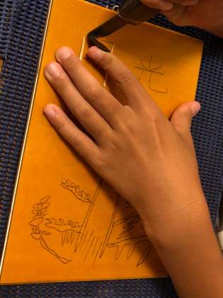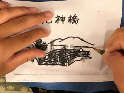 下書きをカーボン紙で板に写します。板に移った下書きに沿って彫っていきます。皆、思い思いの作品を彫っていきました。すぐに彫刻刀の扱いにも慣れてきました。