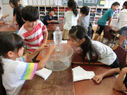 リットルますに1デシリットルの水が何杯入るかをグループで確認しました。