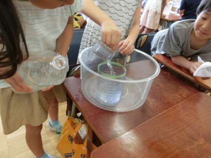 リットルますやデシリットルますを実際に使って水のかさを量っています。