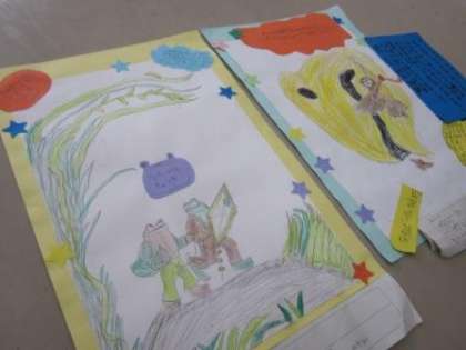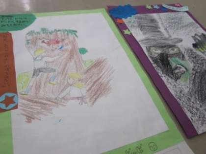 読んだ本の中で、心に残った場面や出来事を絵に描いて紹介しました。