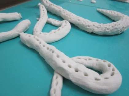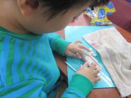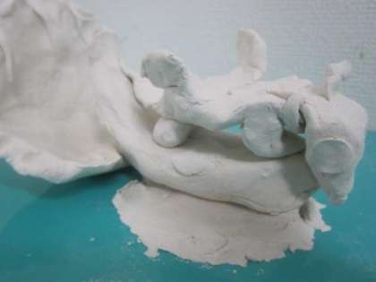 一緒に遊んでみたい空想の動物を想像し、粘土で立体に表しました。自分が作った動物に名前をつけて、丁寧に仕上げました。乾かしてから色をつける予定です。