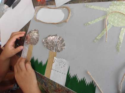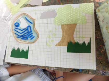 今回の版画は、彫刻刀で版を彫るのではなく、紙やビニルなどの素材を画用紙に張り合わせて、模様をつくります。