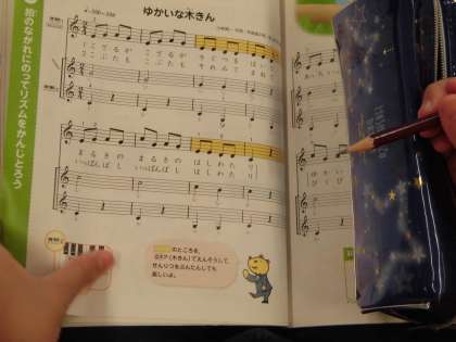 「ゆかいな木きん」では、リコーダーと鍵盤ハーモニカのパートの譜読みが宿題になっていて、子どもたちは、自分で読んだ楽譜が合っているのか少し不安そうに、音符読みで歌っていました。