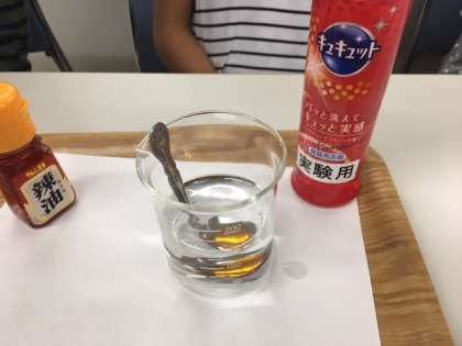花王では、油汚れを洗剤で落とす実験やエコについての話を聞きました。