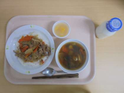 ☆今日は「豚丼」が出ました。スタミナのつく豚肉をたくさん使った料理であり、1年生から6年生までとてもよく食べていました。気温差が大きく、体調管理が難しい時季なのですが、給食をモリモリ食べて元気に過ごしてほしいです。