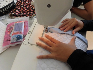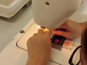 糸通し、下糸の準備、返し縫いなど、慣れないミシンに四苦八苦しています。