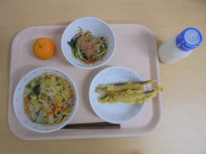 タンメン 牛乳 ししゃものカレー揚げ 野菜のおかかかけ みかん