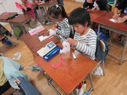 窓ガラスに貼り付くステンドグラスシートを切って、丁寧に桜の花びらを作ります。