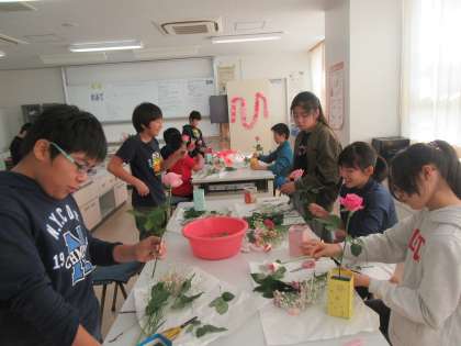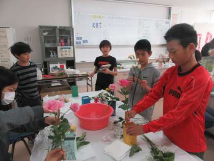 子どもたちの個性が生け方にも表れていて、様々な作品が並んでいます。