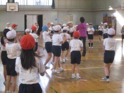 リズム体操の先生をお招きして、たくさん体を動かしました。飛行機やワニになり切ったり、音楽に合わせて走ったりしました。「難しいなあ。」「これは、できそう。」など口にしながら、一生懸命先生の動きを見て真似をしていました。