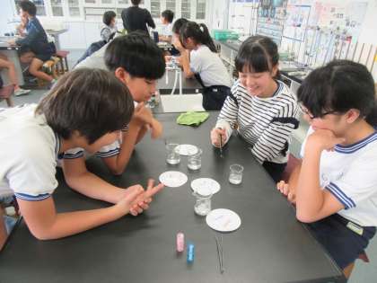 青いリトマス紙、赤いリトマス紙を使って、それぞれ色の変化があるかどうかを観察しました。