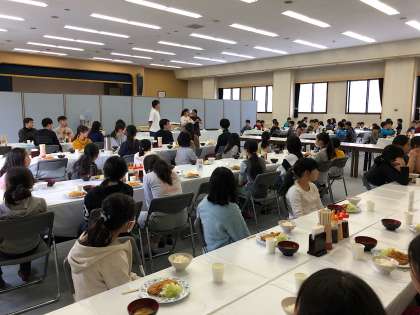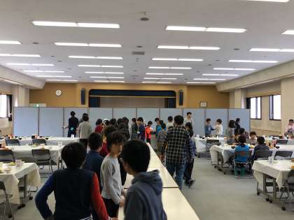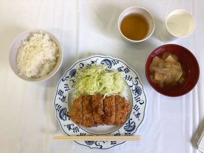 正午、昼食です。とんかつでした。午後は運動量の多いスキーをしますので食べ過ぎに注意しましょうと言われるくらいおかわりの列が出来ていました。