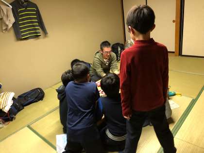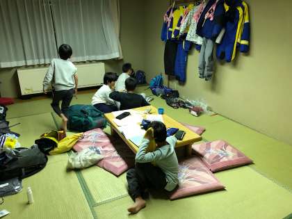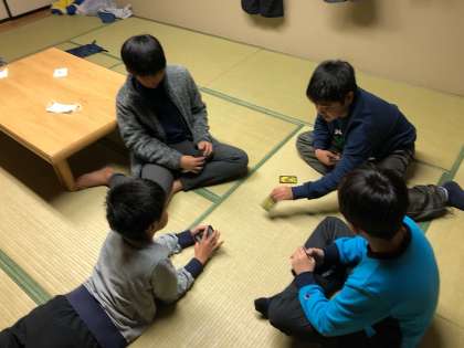 お風呂後の部屋の様子です。トランプをしたり、おしゃべりをしたり、テレビを見たり、それぞれ部屋で楽しんでいました。