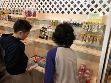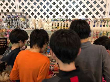 本日の午後5時からは、男子がお土産を購入できる時間帯です。 説明を聞き、順番におみやげコーナーに向かったのですが、一瞬のうちにおみやげ屋さんは大混雑。 在庫はたっぷりで、おみやげがなくなってしまうわけではないのですが、何故か急いでしまうのです。 男子は比較的早めにおみやげを決め、早々におみやげ屋さんは空いていったのが印象的でした。
