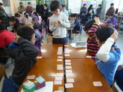 百人一首を4年生が読んでくれて3年生がカルタ取りを楽しみました。