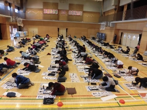 体育館に集まり、集中して「豊かな心」という言葉を書きました。