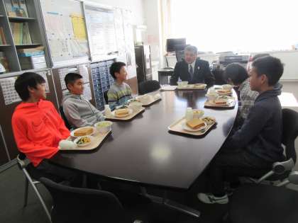 普段、なかなか入らない校長室で一緒に給食を食べるのは、子どもたちにとっては緊張します。