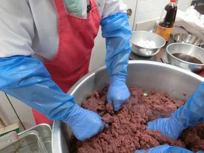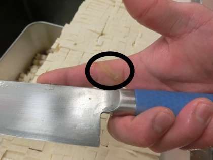 調理のリーダーはチーフと呼ばれている男性の森仰チーフです。森仰チーフの右手ひとさし指ねもとには、包丁ダコがあります。栄養士の宇田川さんと中野さんも今まで見てきた中で一番大きいすごいタコだと言っています。皆さんも、お会いできたら見せてもらってください。校長室前に写真を貼っておきます。
