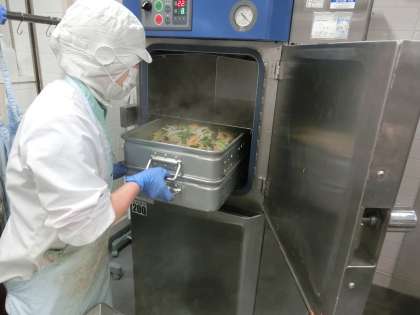給食室には、大型の回転釜が4台あります。水が200リットル入ります。他の学校にはない器具としては、真空冷却器があります。茹でた野菜を急速に冷やしてくれます。この機械がない学校では、回転釜に水を張り、その中に茹で野菜を入れ冷やすので、時間もかかりますし、夏などは20度くらいにしか冷えません。桜小学校のサラダは、10度まで冷やせますので、夏でも冷たいサラダが食べられるわけです。