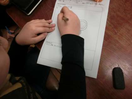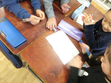 今日は、1年生におもちゃを紹介するための紹介カードを書きました。