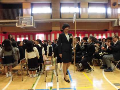 教室では、担任の先生の話を聞いたり、名前を呼ばれては大きな声で返事をしたりしていました。