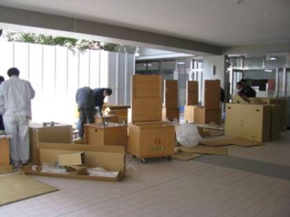 子どもが下校した後、備品の搬入や運搬準備が始まりました。