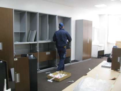 写真(上)----普通教室に置かれる大型テレビのラックを組み立てています。