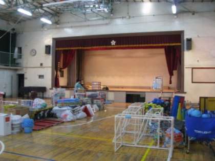 写真(下)----これから体育館奈落の用具を新体育館に運びます。