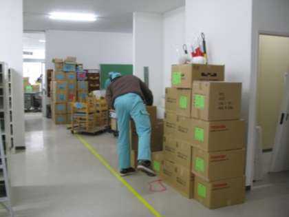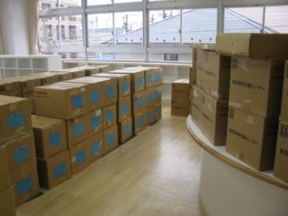 写真(下)----図書室に早々と運ばれた段ボール箱。