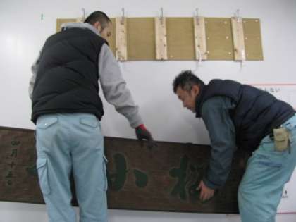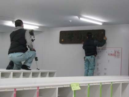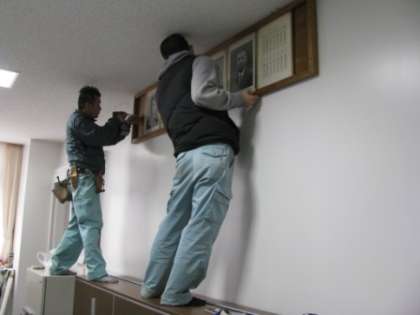 写真(上)----校長室の歴代校長の写真を取り付けているところです。
